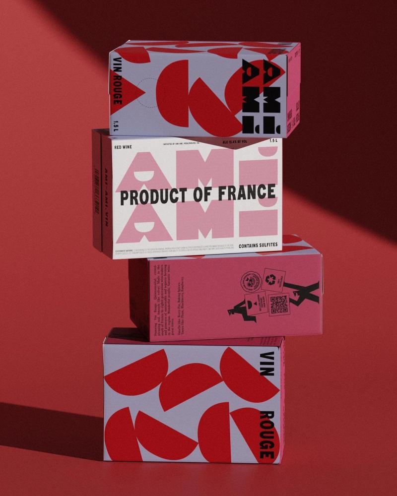 Justin Lortie, founder and design director at Wedge, says the studio knew from the beginning that Ami Ami boxed wine had to grab people by the eyeballs. “Usually, this category is a lower quality wine, and it feels like a label stuck on a box that’s a larger format version of a bottle. You’re not getting the real deal. Woody’s idea was around instead starting a company from the box.