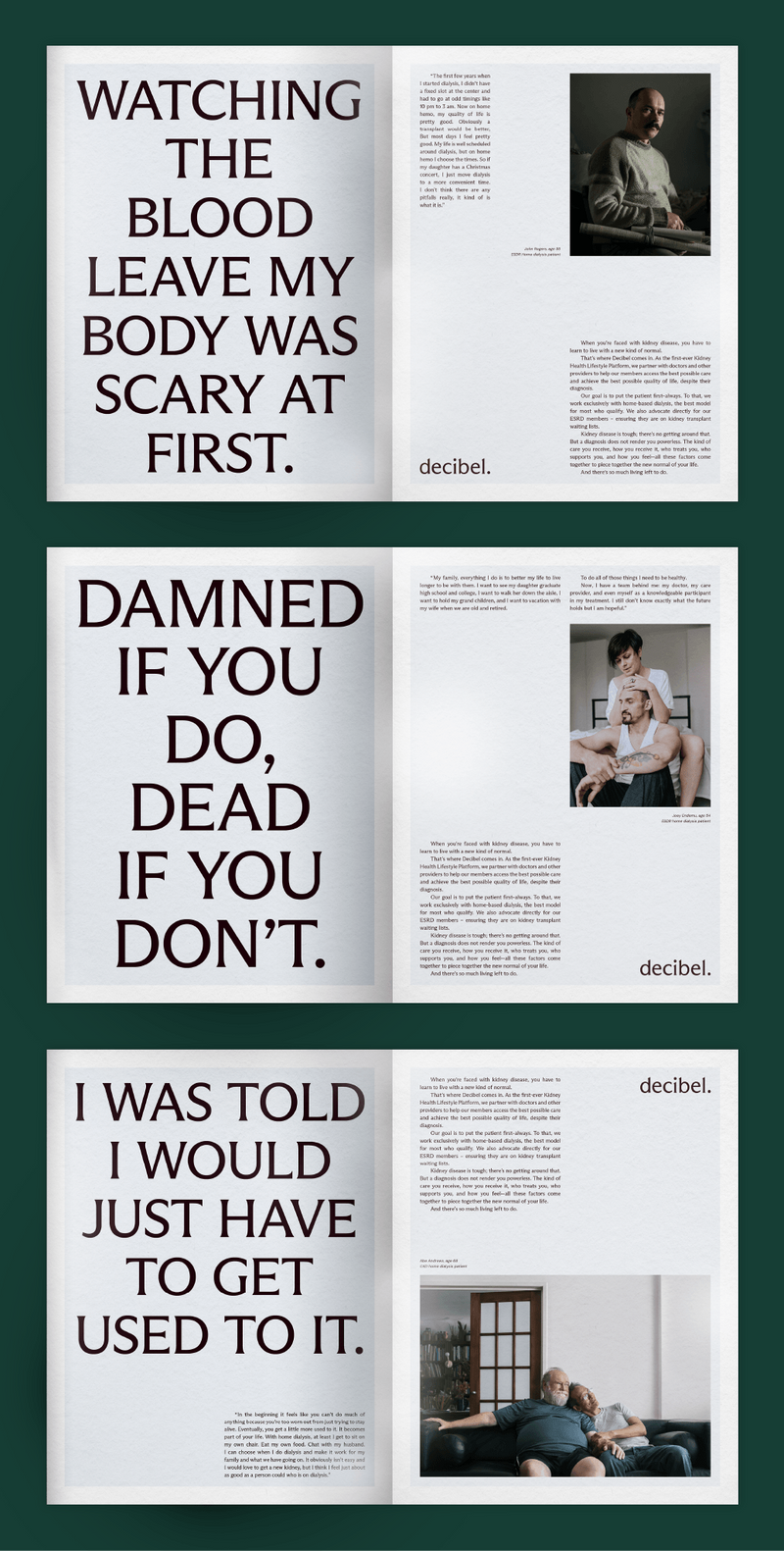 And using language to its utmost doesn’t necessarily mean infusing every piece of copy with flourishes. For example, a recent Nihilo project saw the pair work with Decibel – which provides in-home kidney care and dialysis. “Our goal was just to actually validate what the patient was going through in a real way, and that was a little bit shocking but it was very simple and validating and straightforward,” says Kerr-jarrett. “It didn’t involve a lot of language-bending, it was really saying what it is, and that’s surprisingly uncommon for brands to do.